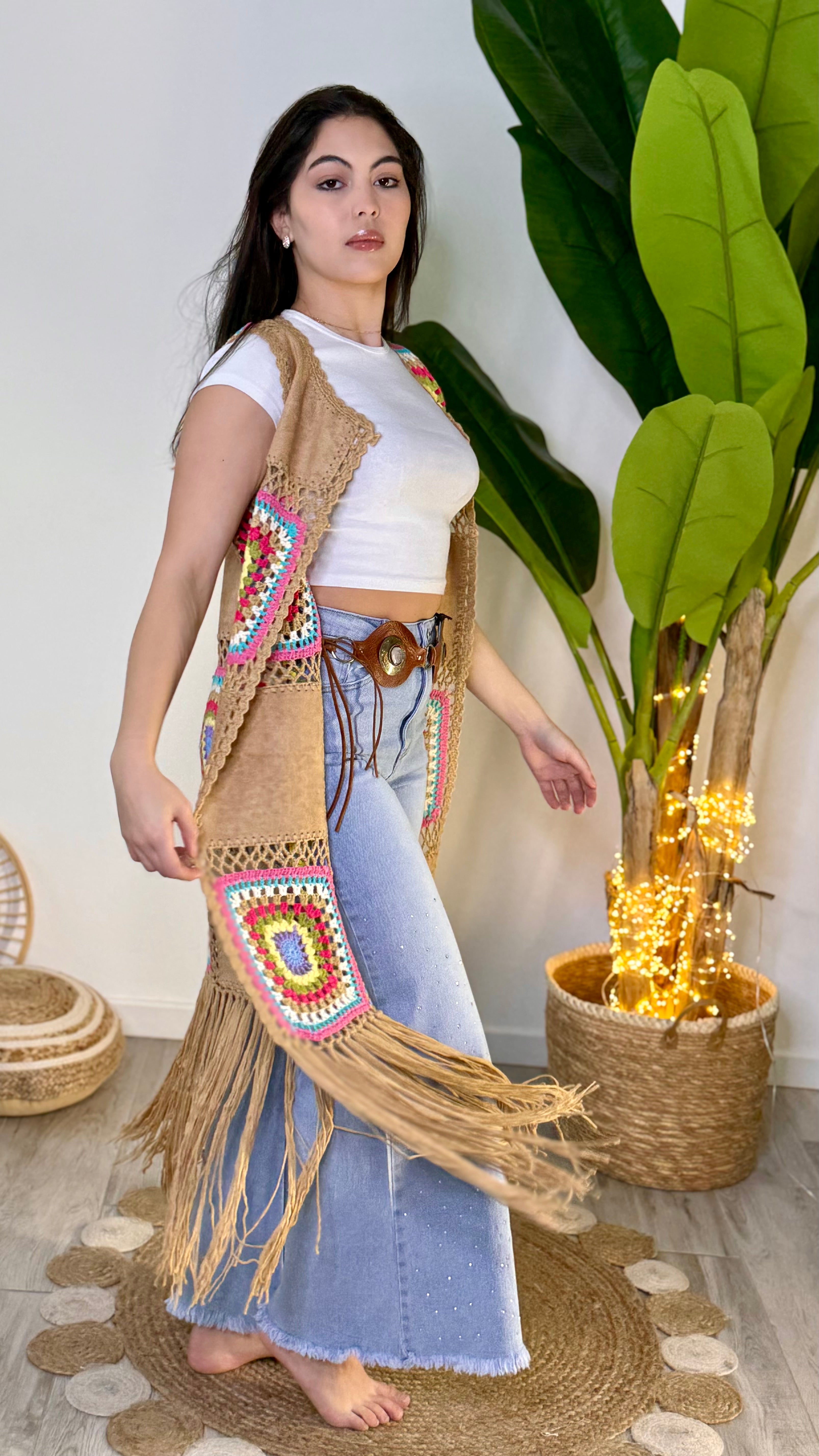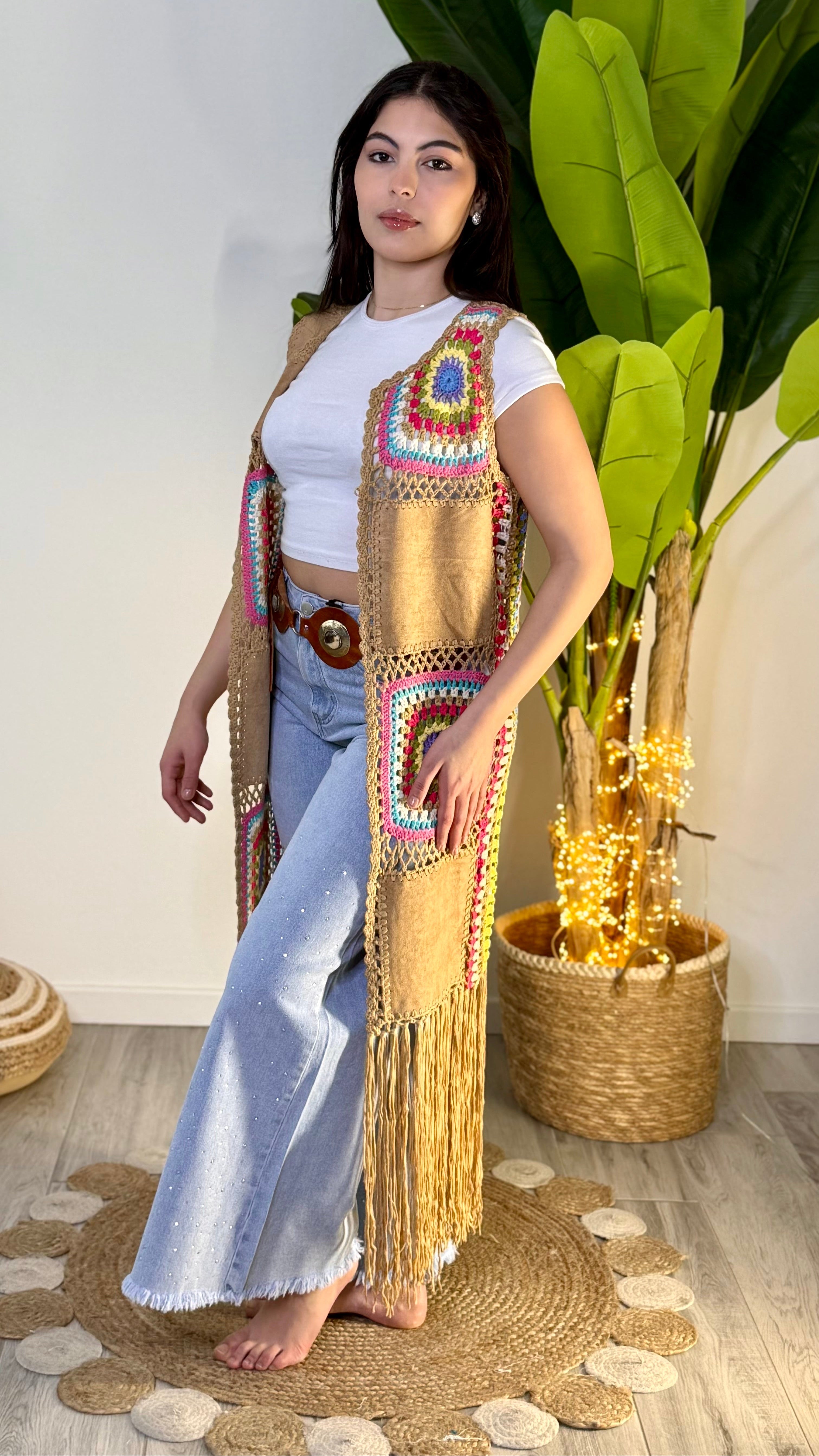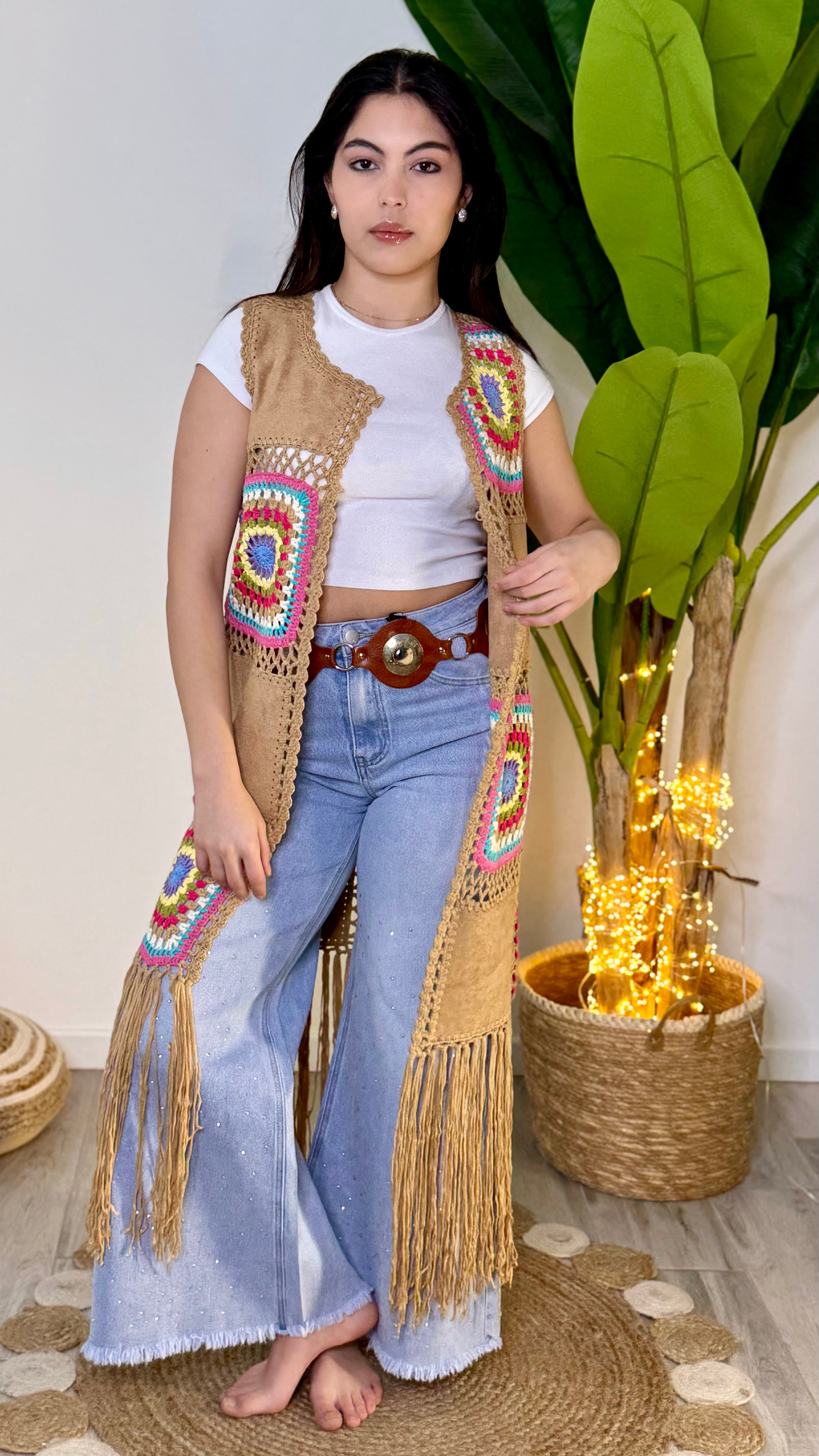 Questo gilet in tessuto scamosciato presenta frange alla moda e dettagli all'uncinetto per un tocco bohémien