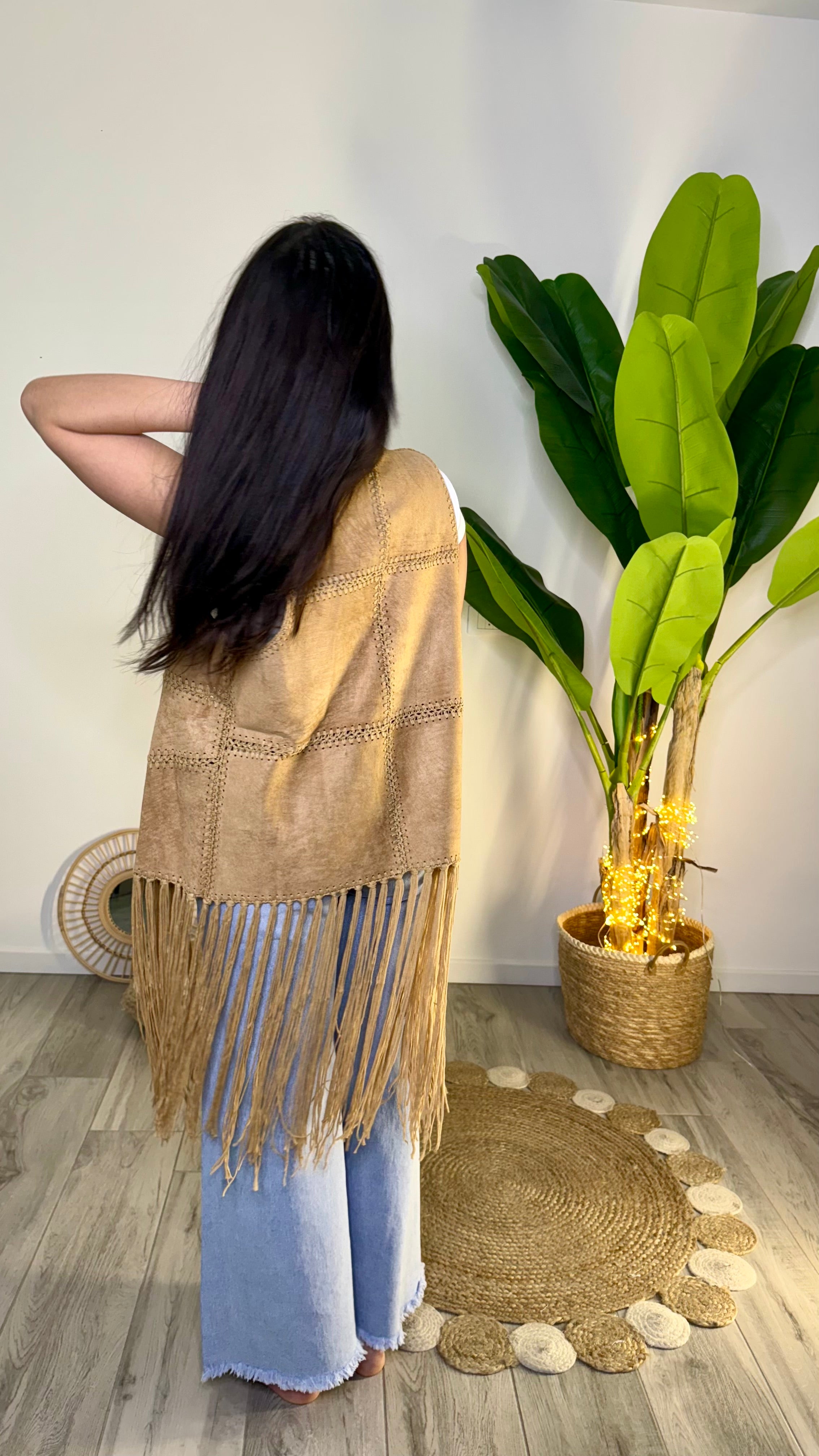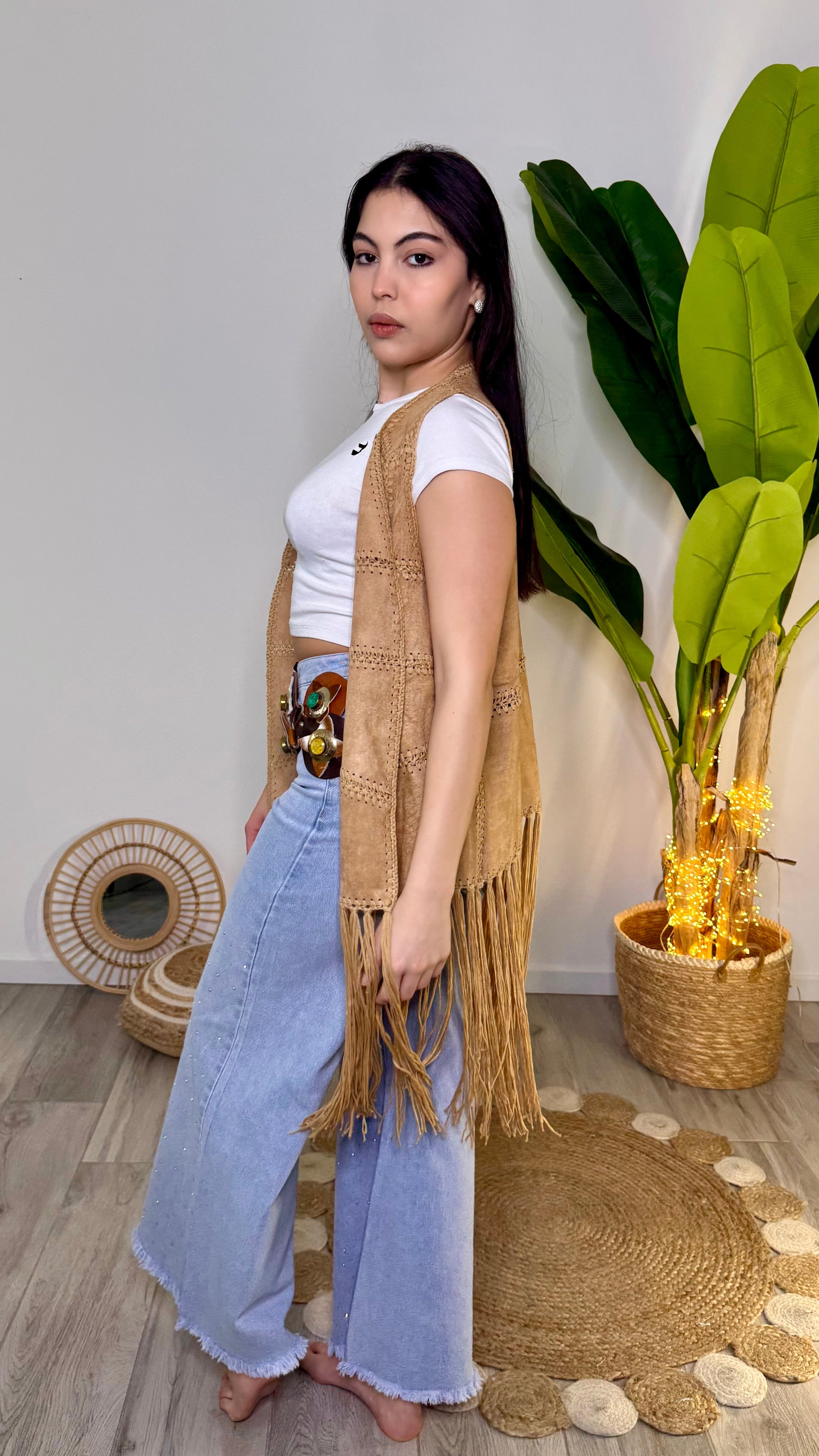 Questo gilet in tessuto scamosciato presenta delle frange giocose, che aggiungono un tocco di stravaganza a qualsiasi outfit. Esalta il tuo guardaroba con questo capo eccentrico ma versatile. Fringe-tastic!